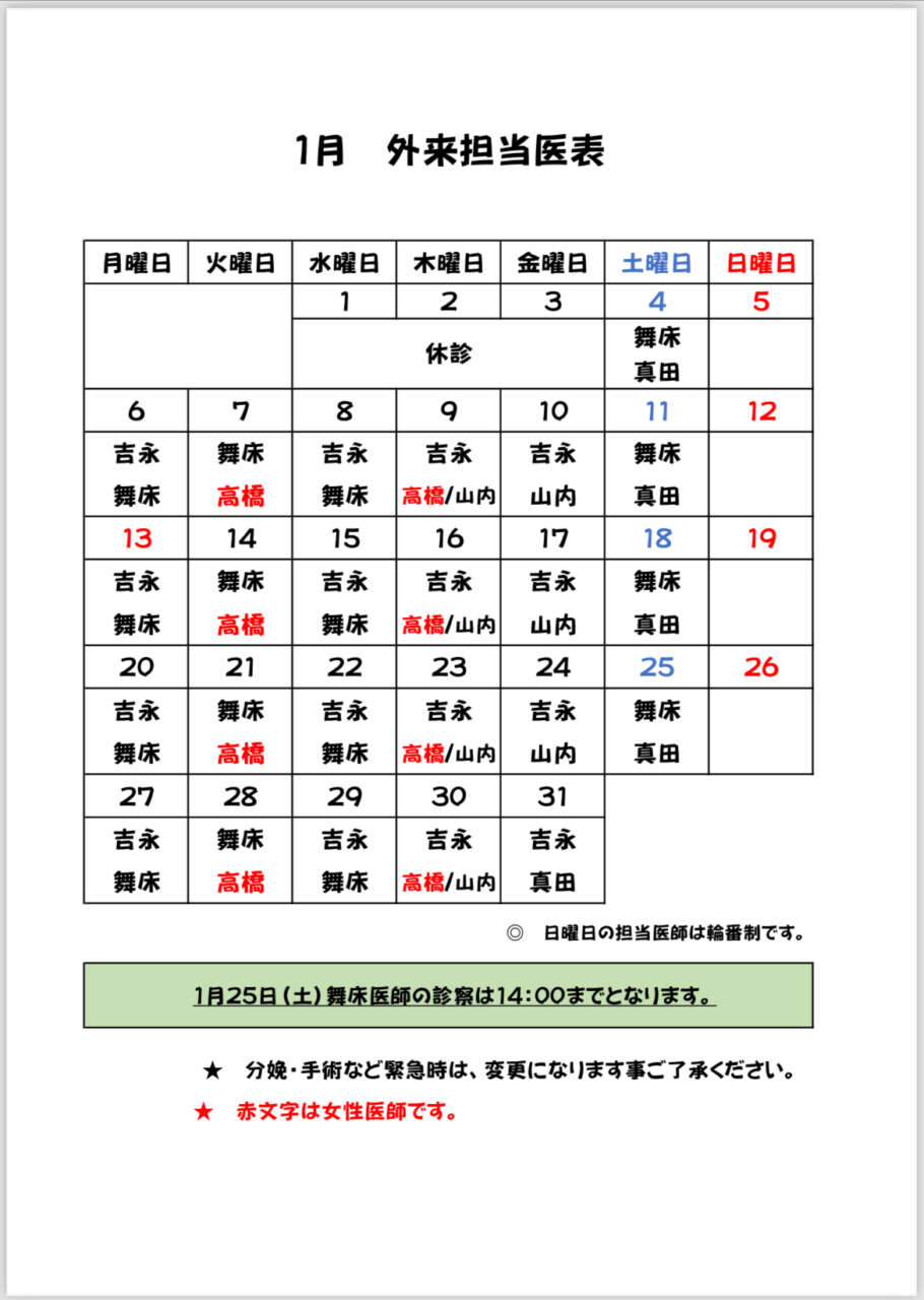 令和7年1月の担当医表を掲載いたします。